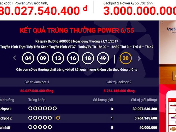 Đây là giải jackpot 2 của chương trình xổ số Power 6/55 mà lần đầu tiên tìm được chủ nhân.