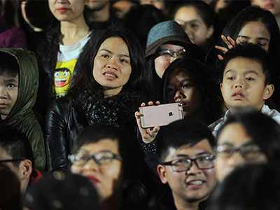 Chị Mai Hoa cùng hai con hòa vào dòng người hâm mộ, giơ tay hát vang những ca khúc của chồng.