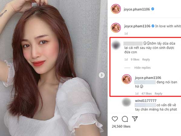 Gần đây, khi Joyce hay đăng ảnh chụp bụng bầu cùng ông xã lên tài khoản Instagram, không ít nick ảo đã nhảy vào bình luận vô cùng khiếm nhã, chửi bới vợ chồng Joyce với lời lẽ xúc phạm.
