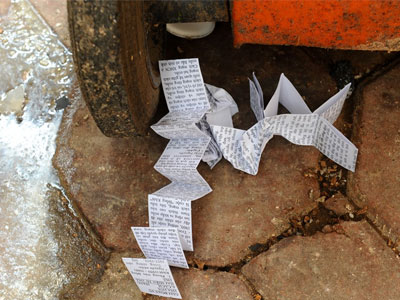 Nhiều tài liệu cỡ nhỏ vứt quanh khu vực cổng trường THPT Đoàn Kết (Hai Bà Trưng, Hà Nội) sau giờ thi môn Lịch sử, sáng 4/7.