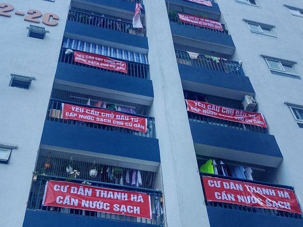 Thay vì được sử dụng nước sạch như mọi nơi khác tại Hà Nội, hàng nghìn cư dân sinh sống tại KĐT Thanh Hà phải chịu cảnh sống chung với nước bẩn. Cực chẳng đã, hàng nghìn hộ dân của 9 tòa chung cư phải treo băng rôn yêu cầu CĐT khắc phục.