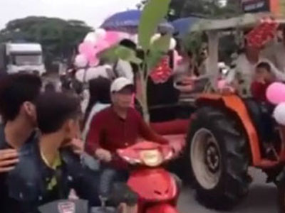 Rước dâu bằng máy cày, trang trí xe hoa bằng 2 cây chuối, nhiều người tham gia đoàn rước dâu bằng xe máy không đội mũ bảo hiểm “đại náo” trên quốc lộ 1A.