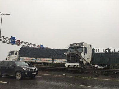 Khoảng 6h sáng nay (18-3), Đội CSGT số 14, Phòng CSGT CATP Hà Nội nhận được tin báo tại chân cầu Thanh Trì hướng sang Gia Lâm xảy ra tai nạn nghiêm trọng. 2 xe tải đâm vào dải phân cách và một xe container mất lái lao xuống lề đường.