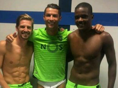 Cris Ronaldo khoe chiếc quần lót có 1 không 2 của mình trong bức ảnh chụp cùng các đồng đội cũ ở Sporting Lisbon trong phòng thay đồ sau trận đấu.