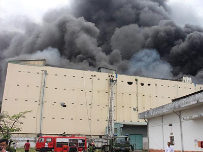Khu nhà xưởng chứa nhiều vật liệu dễ cháy như vải sợi, bông… nên lửa bùng phát dữ dội, kèm theo khói đen dày đặc và khí độc.
