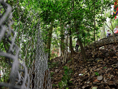 Hàng rào thép gai và nhiều đoạn dây thừng cỡ lớn được ban tổ chức lễ hội Đền Hùng dựng lên tránh tình trạng du khách leo trèo ở những nơi nguy hiểm khi lượng người đổ về quá đông.