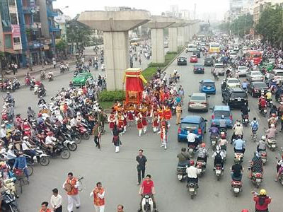 Sáng nay, 31/3, tức ngày 12/2 âm lịch, lễ hội gồm 5 làng Mọc diễn ra. Kiệu được rước đi ngược đường Nguyễn Trãi để vào đền Chính Kinh đã gây ùn ứ đoạn đường này.