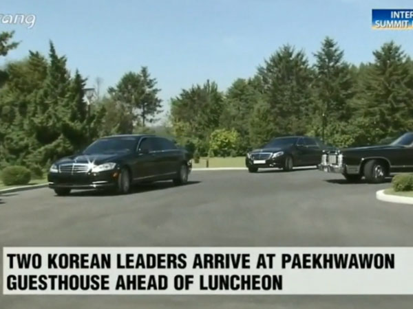 Lãnh đạo Triều Tiên và Hàn Quốc ngồi trên xe mui trần màu đen tới dùng bữa ở nhà khách chính phủ Paekhwawon.