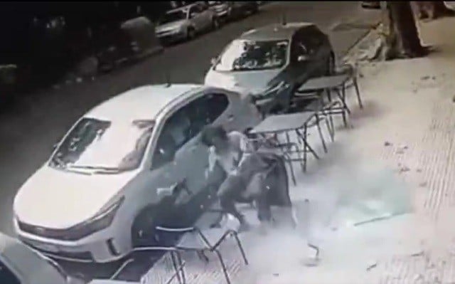 Người đàn ông đang tận hưởng buổi sáng tại không gian ngoài trời của một quán cà phê thì bị một tấm kính lớn từ tòa nhà cao tầng rơi trực diện vào đầu.