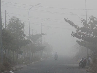 Xe cộ bật đèn lúc 8h sáng vì sương mù dày đặc