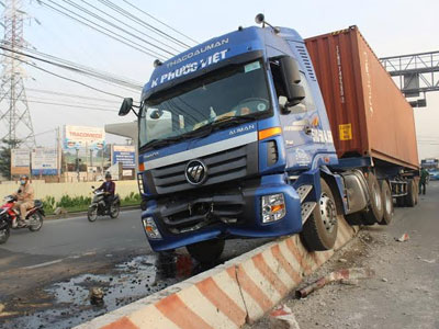 Rạng sáng 13-1, một chiếc xe container khi lưu thông trên xa lộ Hà Nội đoạn qua phường Trường Thọ, quận Thủ Đức, TP HCM đã bất ngờ mất lái, leo lên dải phân cách rồi nằm án ngữ phía trên.