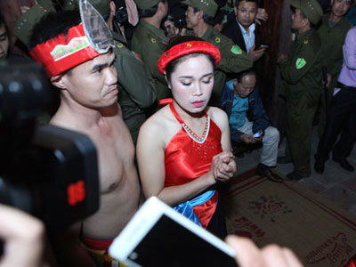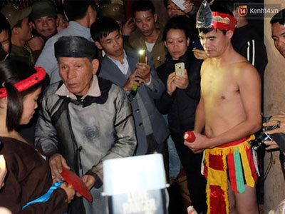 Hai lễ vật nõ và nường (vật tượng trưng cho sinh thực khí nam nữ) mang ra chọi vào nhau 3 lần cầu mong cho nòi giống sinh sôi là nghi thức độc nhất vô nhị ở lễ hội “Linh tinh tình phộc" (Phú Thọ) đêm 18 rạng sáng 19/2.