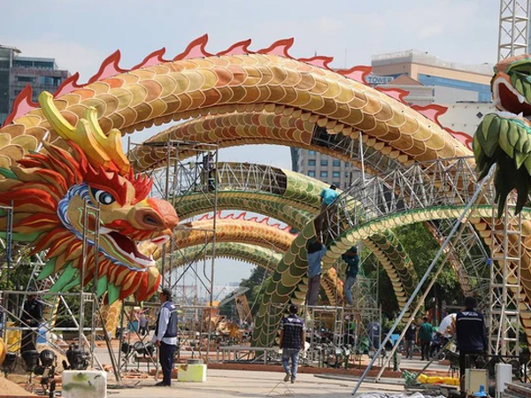 Linh vật rồng khổng lồ trên đường hoa Nguyễn Huệ (TPHCM) đang trong quá trình hoàn thiện nhưng đã gây ấn tượng mạnh với người dân đi ngang qua.