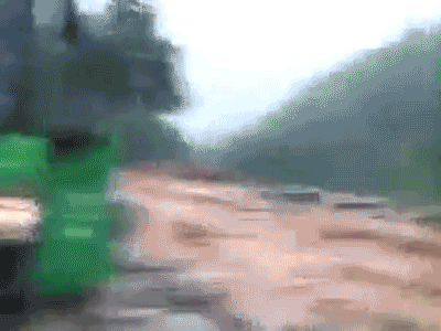 Clip: Xe khách kẹt giữa dòng lũ khi sạt lở đường QL ở Lào Cai