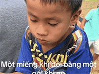 Trang 1Bé trai lấm lem bùn đất ngồi bên đường thưởng thức miếng bánh cứu trợ một cách ngon lành: 'Một miếng khi đói bằng một gói khi no'
