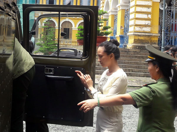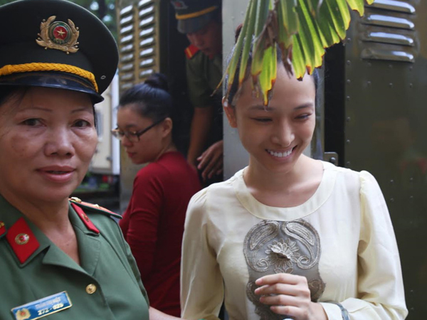 Hoa hậu Phương Nga cười tươi trước khi vào xét xử