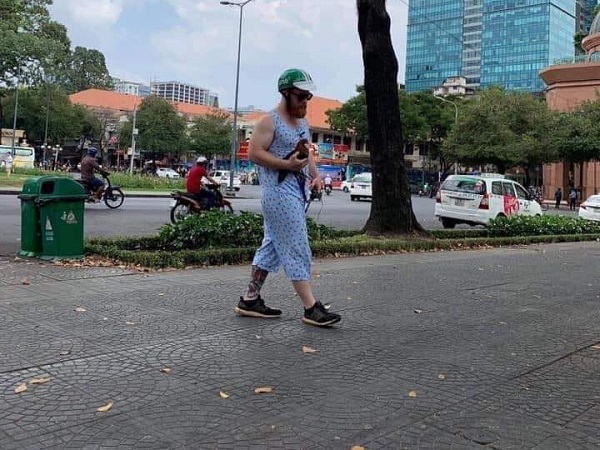 Vì tin lời của chị bán hàng onlie, anh Tây đã không nghi ngại mà diện bộ thời trang "sành điệu" nay ra đường.