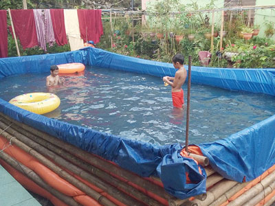 Bé con 9 tuổi của chị Nha có thể thỏa thích vui chơi trong bể nước làm từ tre, bạt, có giá tổng cộng chưa tới 2 triệu.