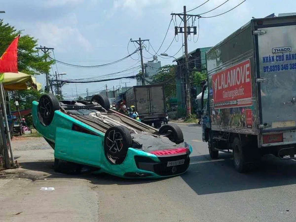 Ô tô biển số TP HCM lật ra ngửa sau va chạm mạnh. Nữ tài xế bị thương nhẹ.