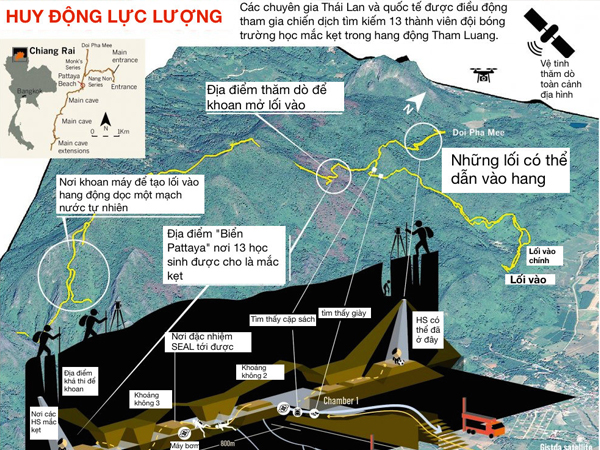 Lực lượng hỗn hợp gồm quân đội, đội cứu hộ địa phương và các thợ lặn quốc tế được điều động tham gia chiến dịch tìm kiếm 13 thành viên đội bóng mắc kẹt trong hang sâu ở Thái Lan.