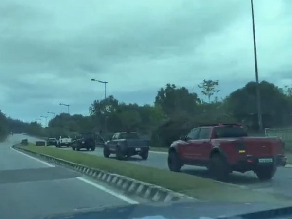 Đoàn xe bán tải hơn 10 chiếc bật đèn khẩn cấp chạy hiên ngang trên đường. Đáng chú ý, chiếc ôtô của người quay clip lại chạy ngược chiều.