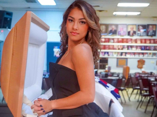 Trong các bức ảnh, Jayne Rivera, 20 tuổi, mặc trang phục màu đen đứng trước quan tài phủ cờ Mỹ của cha ruột. Một bức ảnh ghi lại cảnh cô chắp tay cầu nguyện trước quan tài.