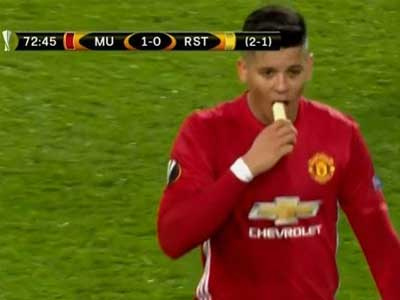Huấn luyện viên Mourinho có hành động đặc biệt khi trao cho Marcos Rojo quả chuối. Việc làm của ông giúp học trò duy trì thể lực để giúp MU bảo vệ chiến thắng tại Europa League.