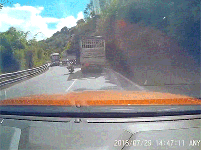 Hai người thoát chết khó tin khi xe máy vượt ẩu giữa 2 xe tải