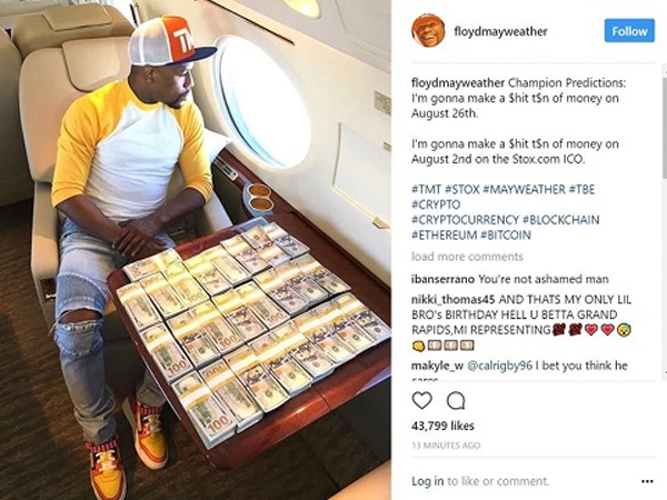 Võ sĩ người Mỹ đăng bức ảnh chụp anh trên phi cơ riêng với một đống tiền trước mặt.