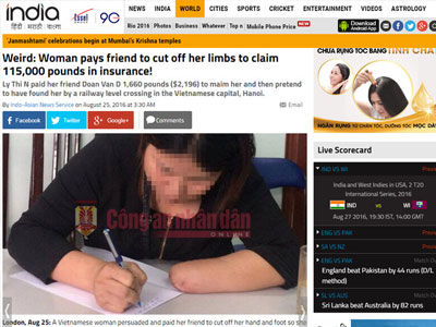 Không chỉ khiến dư luận trong nước choáng váng, vụ việc người phụ nữ đến từ Hà Nội thuê người chặt chân tay, tạo hiện trường giả tai nạn giao thông để được nhận tiền bảo hiểm còn đang được rất nhiều tờ báo lớn trên thế giới đăng tải, thu hút sự chú ý của độc giả.