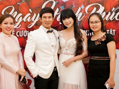 Hai vợ chồng chọn trang phục ton-sur-ton đến tham dự tiệc cưới tập thể cho 60 cặp cô dâu chú rể khuyết tật đã được tổ chức tối 20/10 tại trung tâm tiệc cưới Him Lam Palace, TP.HCM.