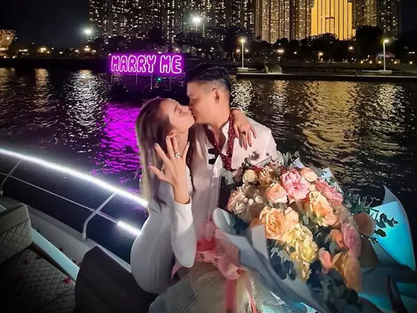 Minh Hằng hạnh phúc khoe nhẫn kim cương được bạn trai đại gia cầu hôn trên du thuyền.