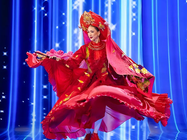 Trong phần thi trang phục dân tộc tại Miss Universe 2023, Bùi Quỳnh Hoa tự tin múa trên sân khấu với trang phục đặc sắc về về màu sắc, họa tiết lấy cảm hứng từ tín ngưỡng hầu đồng.