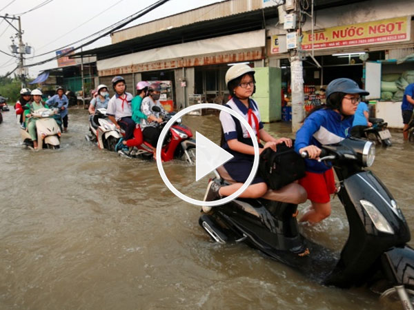 Video: Triều cường Sài Gòn đạt đỉnh, phụ huynh bì bõm đưa con đến trường