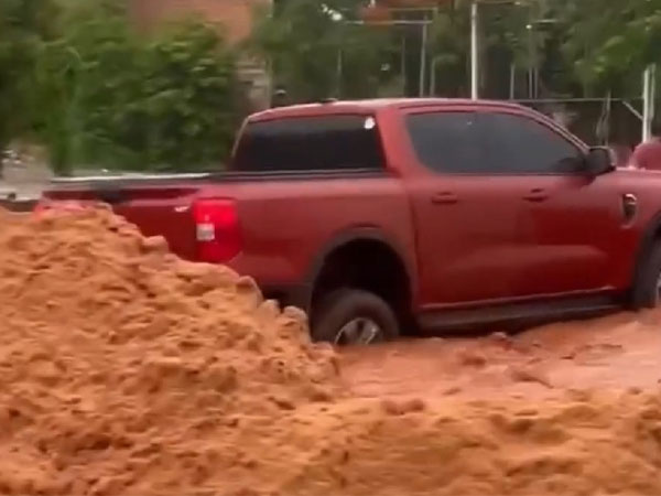 Mưa lớn kéo dài, cát đỏ từ các dự án trên đồi theo dòng nước tràn xuống, gây ách tắc cục bộ đường đi ở Mũi Né, TP Phan Thiết (tỉnh Bình Thuận), nhiều phương tiện không thể di chuyển.