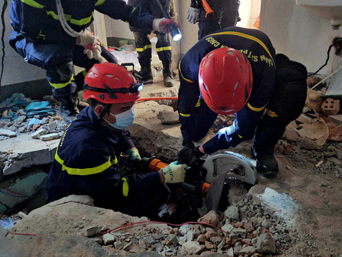 Ngay sau khi tiếp nhận trang thiết bị tìm kiếm cứu nạn được vận chuyển đến hiện trường, lực lượng cứu nạn của Bộ Công an Việt Nam đã khẩn trương đưa máy móc vào khu vực cắt từng mảng bê tông, quyết tâm đưa được bé trai bị mắc kẹt ra khỏi đống đổ nát.