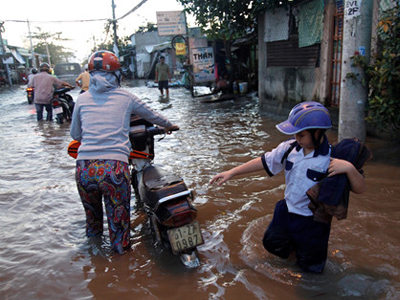 Cảnh người dân lội bì bõm vì triều cường ở Sài Gòn