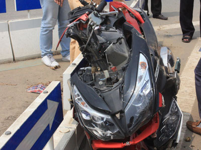 Sau cú va chạm với xe ben chở đất, nam thanh niên ngã ra đường và tử vong tại chỗ, xe máy bị hư hỏng nặng.