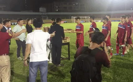 HLV Hoàng Anh Tuấn cho 4 cầu thủ Tiến Dụng, Trọng Đại, Tấn Tài và Quang Hải tập thả lòng ở khách sạn, không ra sân rèn chiến thuật trong buổi tập cuối cùng trước trận bán kết.