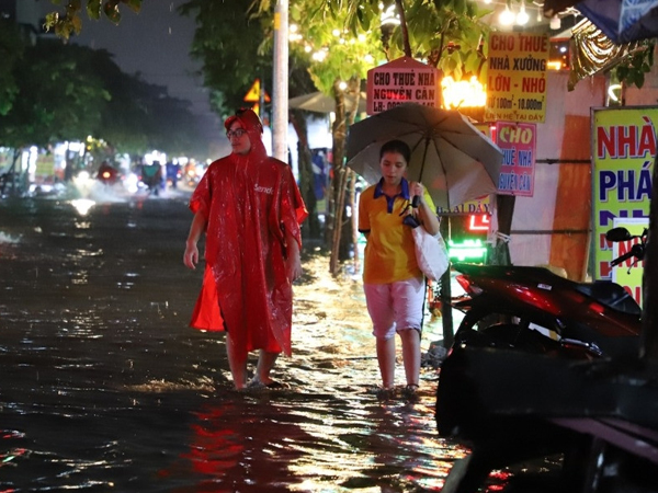 Mưa như trút suốt nhiều giờ khiến một số tuyến đường ở thành phố Tam Kỳ, Quảng Nam ngập sâu. Các phương tiện chết máy, người dân khổ sở đi lại.