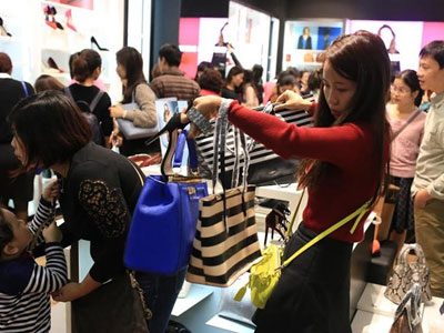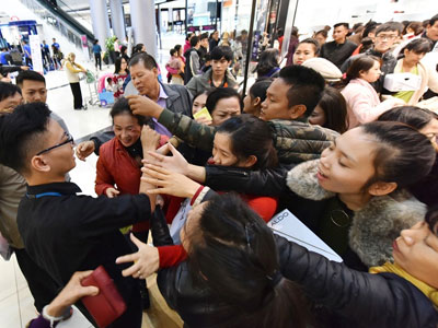 Để tiết kiệm thời gian mua sắm ngày Thứ sáu đen, một gian hàng giày dép tại Hà Nội khuyên khách nên thử giày bằng một chân. Tại địa điểm khác, khách phải lấy số thứ tự thanh toán.