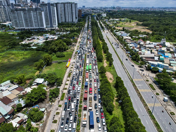 Từ đầu giờ sáng đến trưa nay 1/9, giao thông ở cửa ngõ phía Đông TPHCM đoạn từ đường Mai Chí Thọ đến khu vực nút giao An Phú vào cao tốc TPHCM - Long Thành ùn tắc cục bộ khiến hàng nghìn phương tiện nhích từng chút một.