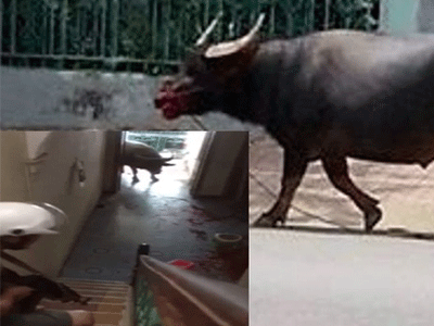 Sau khi bị chích điện nhưng không chết, con trâu điên hoảng loạn lao ra đường rồi xông thẳng vào nhà dân, húc gãy chân một người đàn ông.