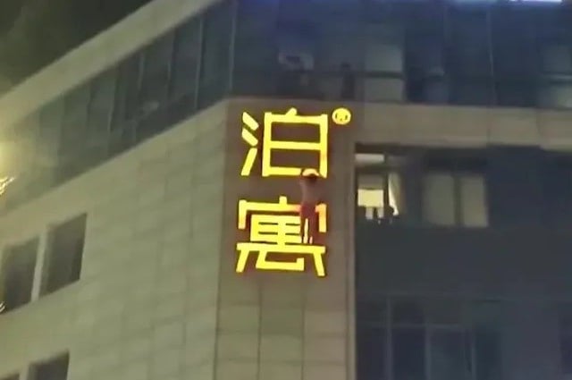 Trang 1Người đàn ông liều mạng treo mình bám vào biển quảng cáo khách sạn, nghi ngoại tình bị bắt quả tang