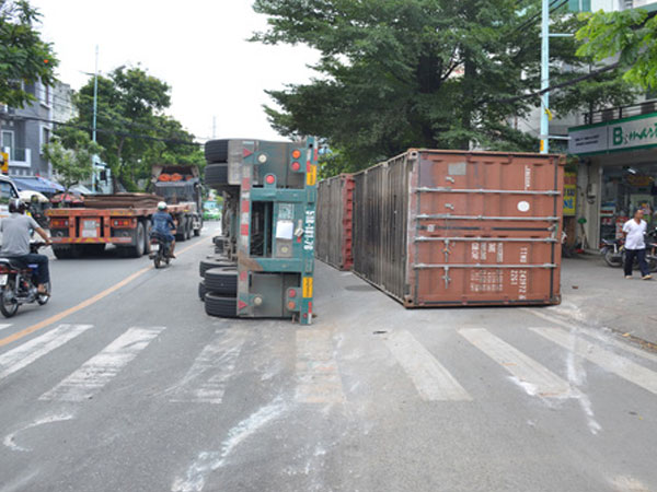 Trong một giờ, khu vực quận 9 (TP HCM) xảy ra 2 vụ lật xe đầu kéo, văng thùng container xuống đường.