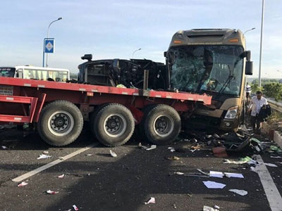 Ít nhất 5 người bị thương nặng sau khi hai ôtô khách và xe container tông nhau trên cao tốc Long Thành - Dầu Giây, rạng sáng nay.