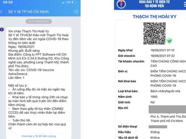 Trước khi tiêm vắc-xin Covid-19, người dân tại TP.HCM sẽ được Sở Y tế TP nhắn tin mời đi tiêm với khung giờ và địa chỉ rõ ràng; đồng thời nhắc khai báo y tế điện tử với đường link sẵn có trên tin nhắn.