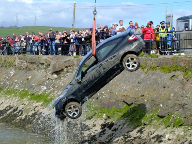 Chiếc Mercedes đã bị một nữ học viên lái xe phi thẳng xuống kênh nước cạn sâu gần 5m. "Đồng hành" cùng chiếc xe có cả một đoạn lan can và chiếc ghế băng dài.
