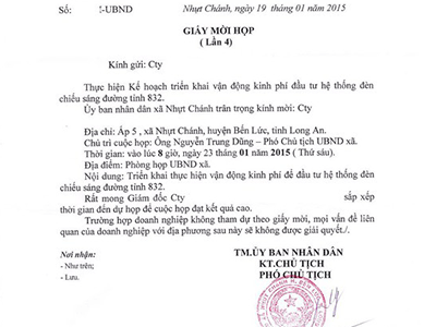 Gửi thư mời kèm theo lời “đe doạ” doanh nghiệp đóng trên địa bàn xã để yêu cầu hỗ trợ kinh phí gắn đèn đường, phó chủ tịch UBND xã Nhựt Chánh, huyện Bến Lức - Long An phải nhận quyết định khiển trách về mặt Đảng, về mặt chính quyền chờ chuyển nhiệm vụ khác.