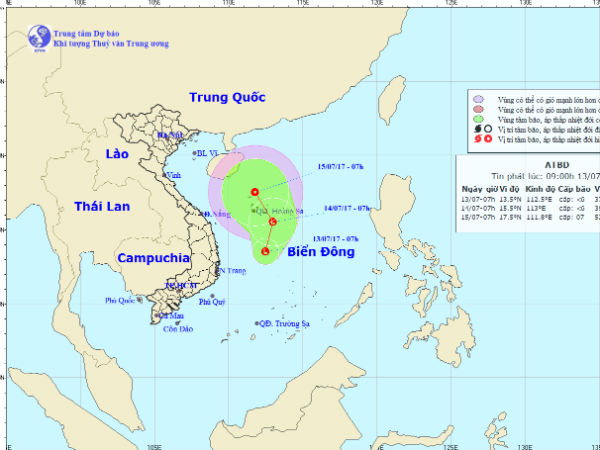 Vùng áp thấp trên Biển Đông đã mạnh lên thành áp thấp nhiệt đới